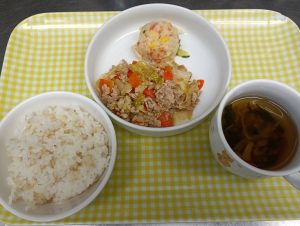 給食:玄米入りご飯 豚肉のごまみそ炒め ポテトサラダ すまし汁(しめじ 三つ葉 玉ねぎ)