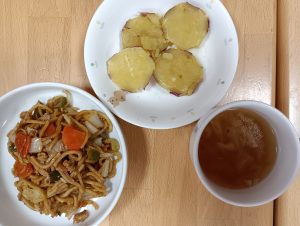 給食:焼きそば・さつま芋の甘煮・スープ(玉ねぎ・キャベツ・ベーコン)