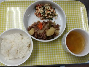 給食:ご飯・肉じゃが・白和え・みそ汁(かぼちゃ・もやし・油揚げ)