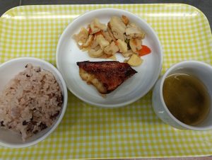 給食:小豆ご飯 赤魚の醤油バター焼き 筑前煮 味噌汁(油揚げ ねぎ 小松菜)