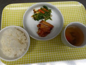 給食:ごはん 鶏のマーマレード焼き ほうれん草ごま和え スープ(人参 ピーマン キャベツ)