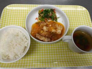 給食:玄米入りご飯・鶏ちり・大根と小松菜のサラダ・スープ(チンゲン菜・えのき・人参)