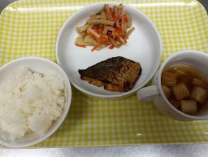 給食:ごはん・鰆の西京焼き・五目きんぴら・すまし汁(麩・玉ねぎ・ネギ)
