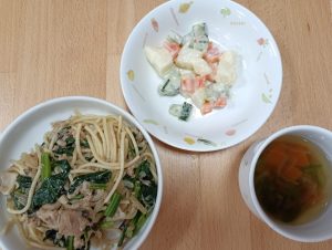 給食:和風スパゲティ・マセドアンサラダ・スープ(玉ねぎ・人参・ピーマン)