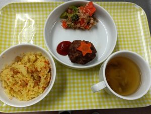 給食:カレーピラフ・ハンバーグ・ブロッコリーサラダ・スープ(じゃが芋・ピーマン・玉ねぎ)