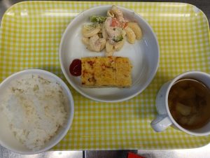 給食:ご飯 ポテトミートローフ マカロニサラダ スープ(ピーマン 玉ねぎ 白菜)