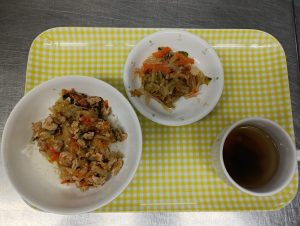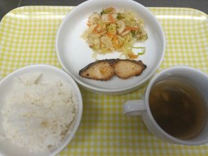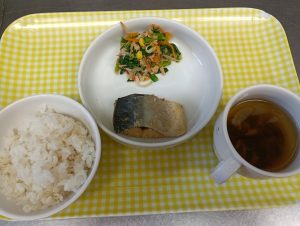 給食:ご飯・鰆のみそ焼き・キャベツときゅうりのごま酢和え・すまし汁(わかめ。油揚げ・ねぎ)