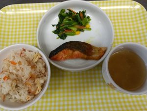 給食:桜えびの炊き込みご飯 鮭のカレーマヨ焼き 小松菜とコーンの和え物 味噌汁(しめじ じゃが芋 大根)