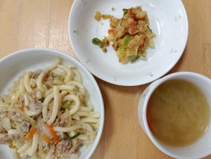 給食:焼きうどん・じゃが芋とピーマンのきんぴら・みそ汁(じゃが芋・玉ねぎ・いんげん)