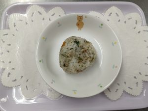 給食:ごはん・鶏のから揚げ・チンゲン菜のおかか和え・味噌汁(わかめ・豆腐・こまつな)