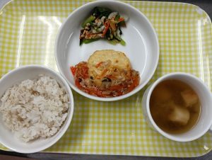 給食:麦入りご飯 和風ハンバーグ 納豆和え みそ汁(焼き麩 わかめ 玉ねぎ)