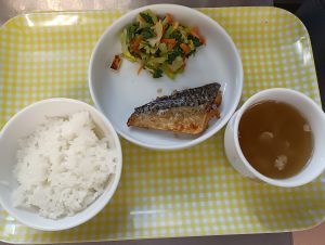 給食:ご飯 鯖の甘辛焼き チンゲン菜のおひたし 豚汁