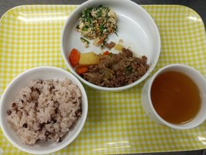 給食:小豆ご飯・肉じゃが・白和え・みそ汁(かぼちゃ・もやし・油揚げ)