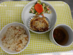 給食:桜えびピラフ・スコップコロッケ・ブロッコリーサラダ・スープ(ピーマン・えのき・にんじん)