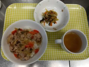 給食:豚丼・チンゲン菜の煮浸し・みそ汁(豆腐・大根・もやし)
