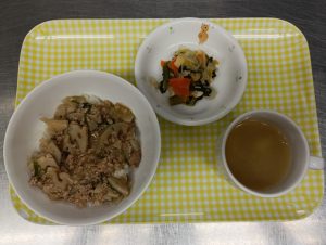給食:れんこんの中華風そぼろ丼・白菜の煮びたし・みそ汁(大根・なめこ・豆腐)