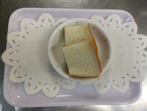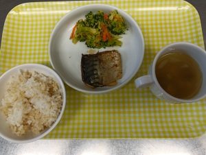 給食:玄米入りご飯 鯖の甘辛焼き ブロッコリーじゃこ和え みそしる(小松菜 しめじ 油揚げ)