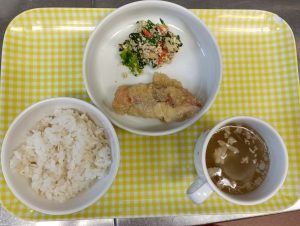 給食:麦入りご飯・赤魚のおろし煮・白和え・豚汁(豚肉・なす・じゃがいも・たまねぎ・人参)