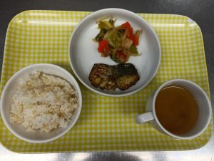 給食:玄米入りご飯・鰆の磯辺焼き・野菜炒め・みそ汁(じゃが芋・玉ねぎ・いんげん)