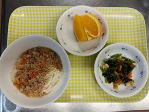 給食:肉みそそうめん 小松菜のごま和え オレンジ