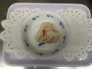 給食:桜えびご飯 鶏つくねの照り焼き 白菜と青菜のおかか和え 味噌汁(豆腐・ねぎ・わかめ)